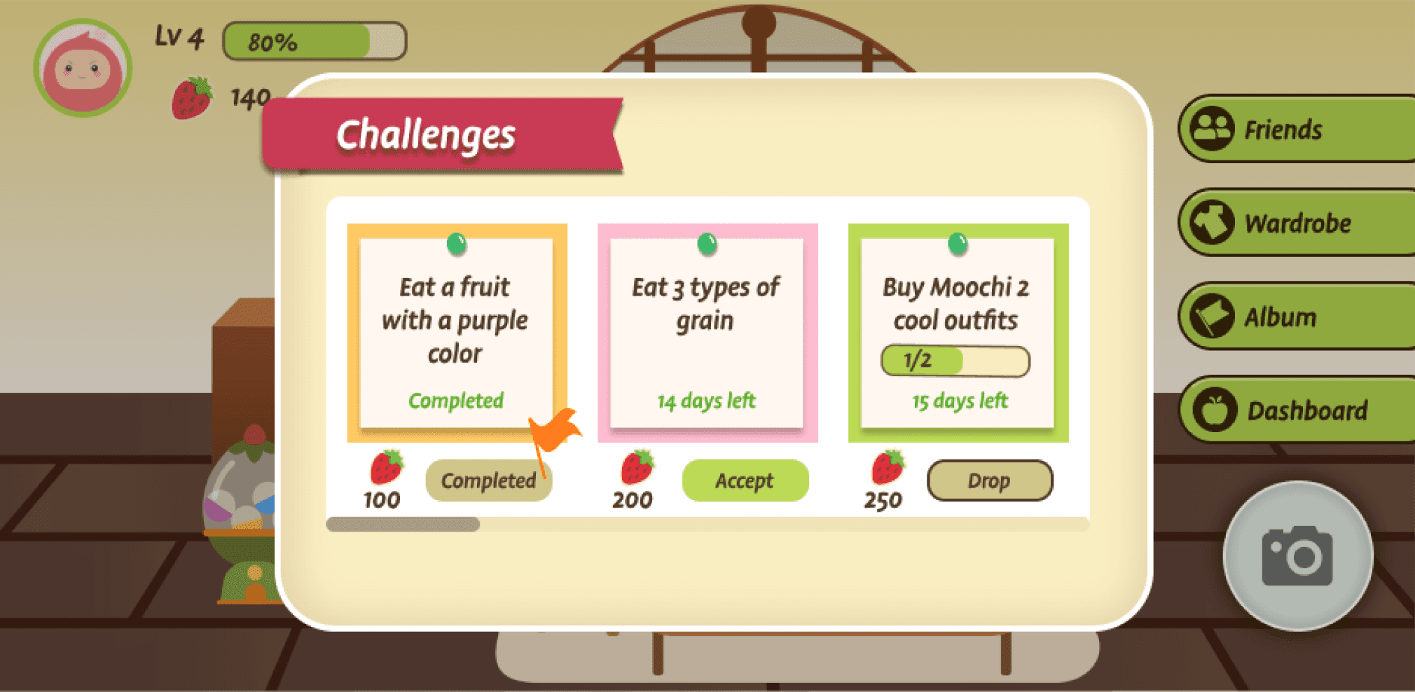 To keep kids motivated, we added new daily and cooperative challenges along with a friend leaderboard. These features encourage healthy eating through fun goals and teamwork, while rewarding progress with points and achievements.
